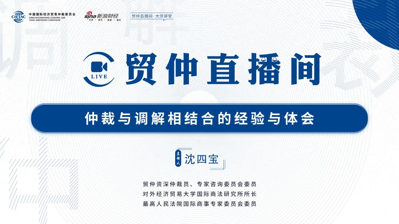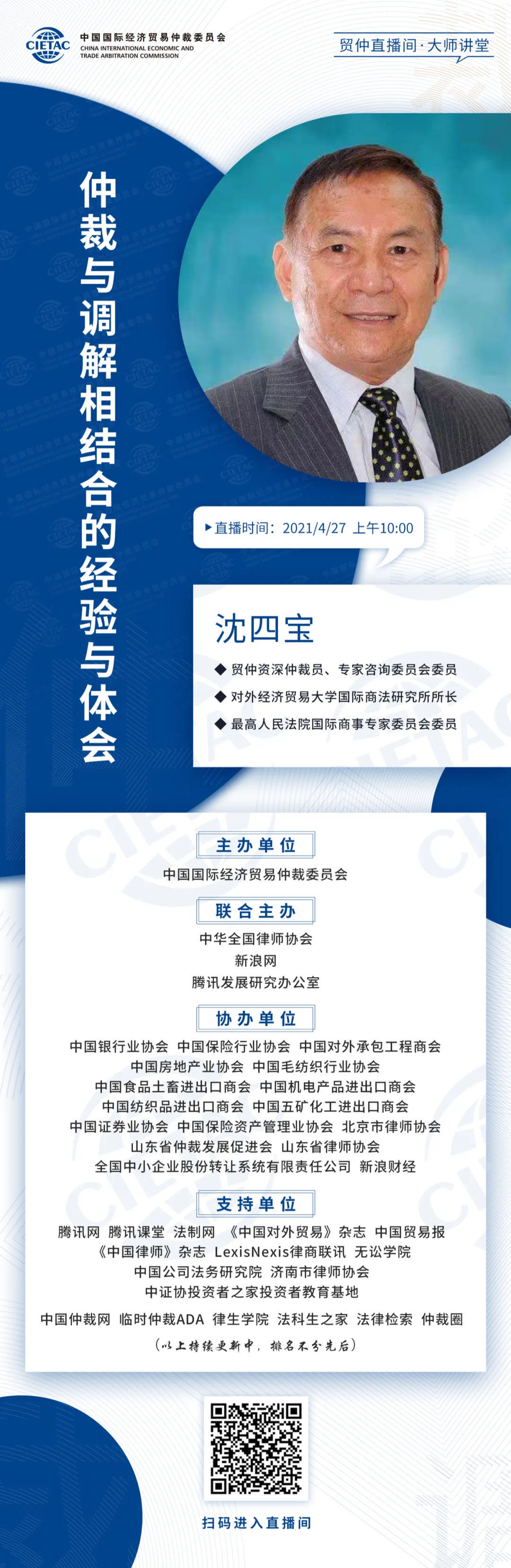 貿(mào)仲直播間-大師講堂系列課程第三講將于2021年4月27日(星期二)上午10時(shí)邀請貿(mào)仲資深仲裁員、專家咨詢委員會(huì)委員,對外經(jīng)濟(jì)貿(mào)易大學(xué)國際商法研究所所長,最高人民法院國際商事專家委員會(huì)委員沈四寶教授,講解“仲裁與調(diào)解相結(jié)合的經(jīng)驗(yàn)與體會(huì)”。