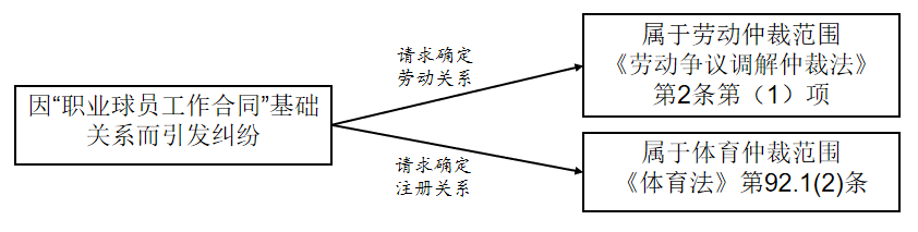 職業(yè)球員是俱樂部勞動者,但是從事特殊勞動勞動者,因此職業(yè)球員不僅具有勞動者身份,也是球員的特殊勞動者身份。因此,依據(jù)球員訴請的內(nèi)容,來判斷管轄:如請求確認勞動者身份,即勞動關(guān)系確認(勞動爭議調(diào)解仲裁法第二條第(1)項“因確認勞動關(guān)系發(fā)生的爭議”),屬于勞動仲裁范圍;如請求確認球員身份(特殊勞動者),即要求明確球員的注冊身份問題(體育法第九十二條第1款第(2)項“因運動員注冊、交流發(fā)生的糾紛”),則屬于體育仲裁范圍,如下圖。