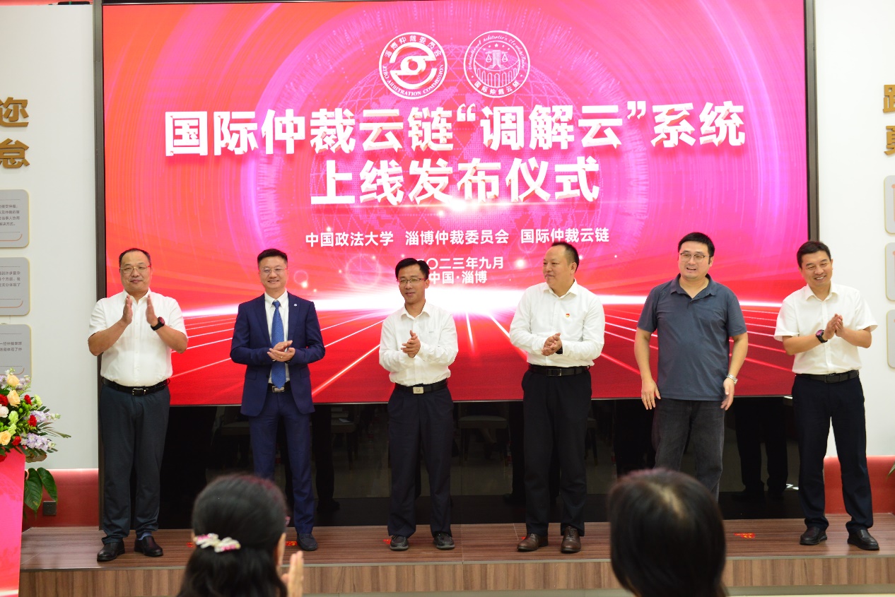 山東省司法廳一級調(diào)研員李世敏,淄博仲裁辦黨組書記、主任張公博,淄博仲裁辦黨組成員、副主任閆世學(xué),中國政法大學(xué)副教授、國際仲裁云鏈理事會副理事長周蔚,中國政法大學(xué)網(wǎng)絡(luò)安全和信息化辦公室副主任張軼舸,泰杭律師事務(wù)所主任、國際仲裁云鏈理事會理事汪政共同為調(diào)解云系統(tǒng)上線揭牌。