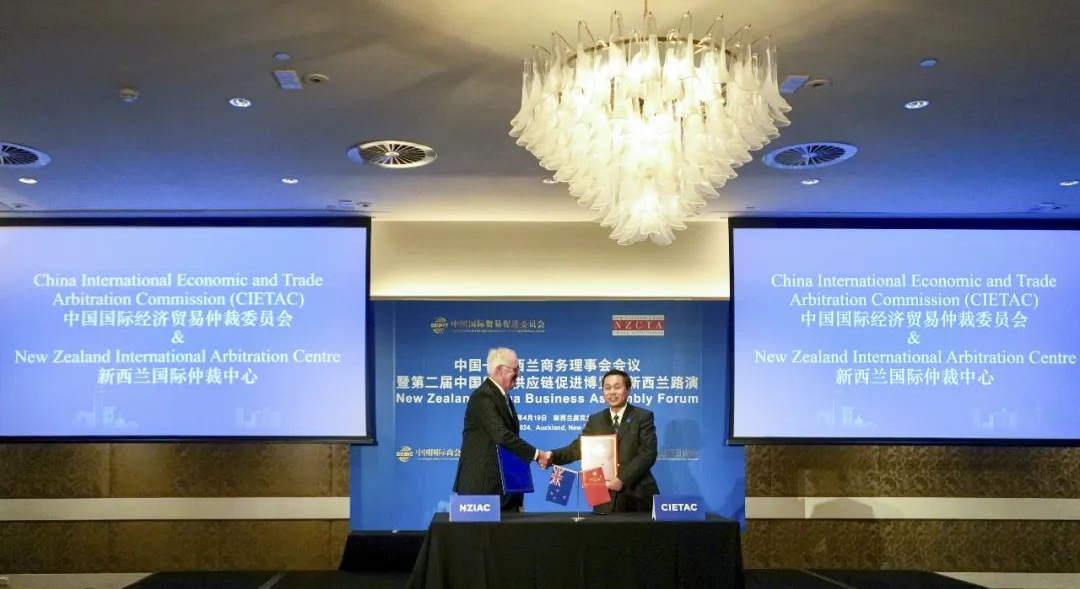 貿(mào)仲代表團(tuán)出席了由中國貿(mào)促會和新西蘭中國貿(mào)易協(xié)會共同主辦的中國-新西蘭商務(wù)理事會會議暨第二屆中國國際供應(yīng)鏈促進(jìn)博覽會新西蘭路演。任鴻斌會長出席活動并致辭,新西蘭-中國貿(mào)易協(xié)會主席約翰·考克倫(John Cochrane)、新西蘭貿(mào)發(fā)局大中華區(qū)主任白安祖(Andrew White)、中國駐新西蘭大使王小龍、駐奧克蘭總領(lǐng)事陳世杰等出席活動,中新兩國工商界代表200余與會。會上,貿(mào)仲副主任兼秘書長王承杰與新西蘭國際仲裁中心主任約翰·格林(John Green)代表雙方簽訂了合作協(xié)議。該合作協(xié)議搭建了中新兩國仲裁機(jī)構(gòu)的交流平臺,有利于通過共同努力增進(jìn)中方和新方企業(yè)在仲裁、爭議風(fēng)險防范等方面的認(rèn)識與理解。