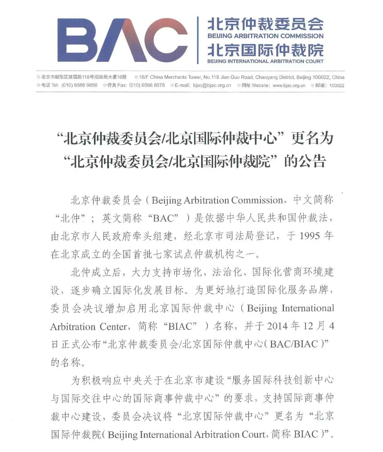 12月10日,記者從“建設(shè)國際一流仲裁機(jī)構(gòu) 助力國際商事仲裁中心建設(shè)”新聞發(fā)布會(huì)上獲悉,為積極響應(yīng)中央關(guān)于在北京市打造“服務(wù)國際科技創(chuàng)新中心與國際交往中心建設(shè)的國際商事仲裁中心”的要求,支持國際商事仲裁中心建設(shè),經(jīng)北京市司法局依法變更登記,12月4日“北京仲裁委員會(huì)/北京國際仲裁中心”的名稱變更為“北京仲裁委員會(huì)/北京國際仲裁院”(以下簡(jiǎn)稱北仲)。