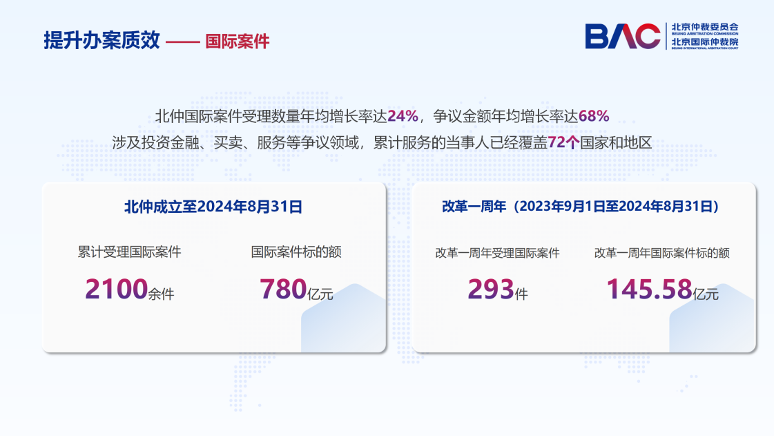 歷經(jīng)十年,北仲的國(guó)際化發(fā)展成績(jī)斐然。截至2024年8月31日,北仲累計(jì)受理國(guó)際案件2100余件,所涉標(biāo)的額達(dá)780億元,主要涉及投資金融、買(mǎi)賣(mài)、服務(wù)等爭(zhēng)議領(lǐng)域,累計(jì)服務(wù)的當(dāng)事人已經(jīng)覆蓋72個(gè)國(guó)家和地區(qū)。其中,改革換屆以來(lái),自2023年9月1日至2024年8月31日,北仲受理國(guó)際案件293件,爭(zhēng)議金額達(dá)145.58億元,分別占北仲?lài)?guó)際案件受理總量的13.95%和國(guó)際案件受理總金額的18.66%。