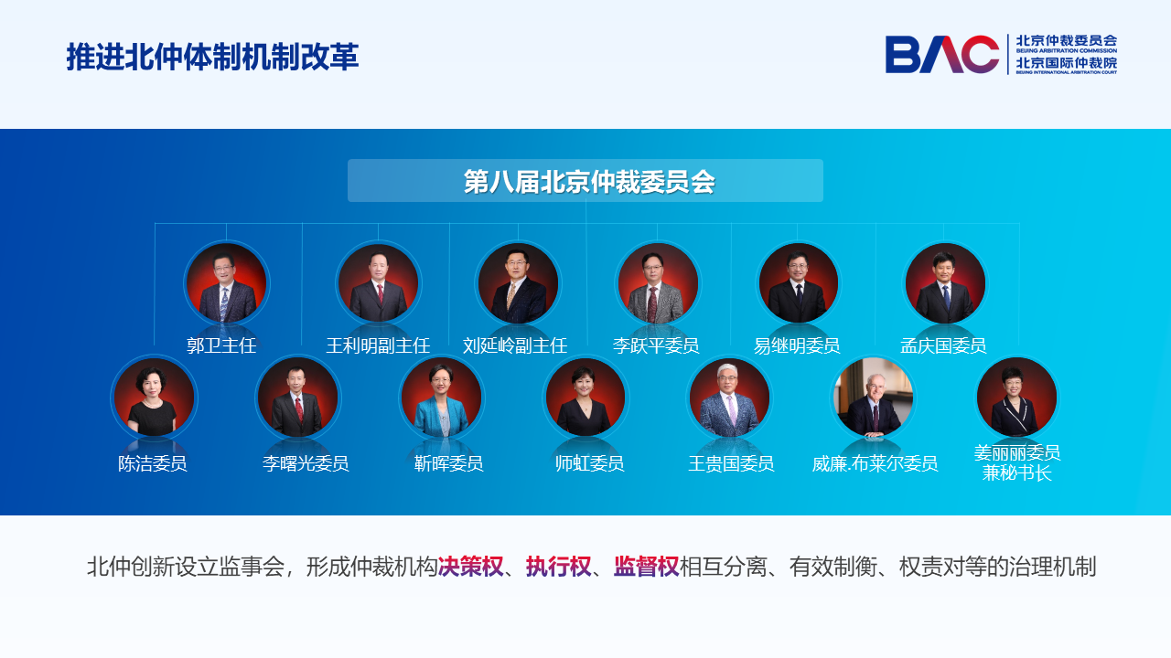 據(jù)介紹,北仲本輪體制機(jī)制改革是以第八屆仲裁委員會(huì)換屆為標(biāo)志的。2023年9月,由13位在法律、金融、數(shù)字經(jīng)濟(jì)、知識(shí)產(chǎn)權(quán)、國(guó)際商事?tīng)?zhēng)議解決等領(lǐng)域的資深專(zhuān)家組成的第八屆北仲委員會(huì)成立,其中包括兩名境外專(zhuān)業(yè)人士。同時(shí),北仲創(chuàng)新設(shè)立了監(jiān)事會(huì)作為實(shí)體運(yùn)行的監(jiān)督機(jī)構(gòu),與秘書(shū)局共同形成了仲裁機(jī)構(gòu)決策權(quán)、執(zhí)行權(quán)、監(jiān)督權(quán)相互分離、有效制衡、權(quán)責(zé)對(duì)等的法人治理機(jī)制。