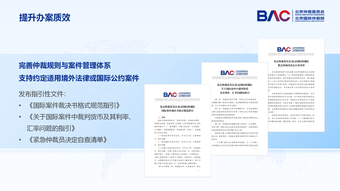 近五年來(lái),北仲處理了大量約定適用境外法律或國(guó)際公約,以及以外語(yǔ)為仲裁語(yǔ)言的案件,具備處理復(fù)雜國(guó)際商事爭(zhēng)議的全球化思維及豐富的經(jīng)驗(yàn),能夠滿足境內(nèi)外當(dāng)事人的多元爭(zhēng)議解決需求。北仲還發(fā)布了與國(guó)際主流實(shí)踐接軌的指引性文件并在實(shí)踐中廣泛適用,比如發(fā)布了《國(guó)際案件裁決書格式規(guī)范指引》《關(guān)于國(guó)際案件中裁判貨幣及其利率、匯率問(wèn)題的指引》《緊急仲裁員決定自查清單》等。