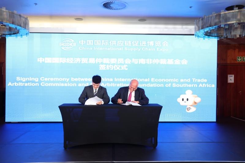 2月20日,在中國-南非經(jīng)貿(mào)論壇暨第三屆鏈博會推介會上,中國國際經(jīng)濟(jì)貿(mào)易仲裁委員會(簡稱貿(mào)仲)與南非仲裁基金會簽署合作協(xié)議,并在中國貿(mào)促會會長任鴻斌、中國駐南非使館公使李志剛、南非豪登省副省長雅各布·馬馬波羅以及現(xiàn)場來自中非多國和地區(qū)的政府機(jī)構(gòu)、工商界法律界代表200余人的共同見證下,舉辦了簽約儀式。