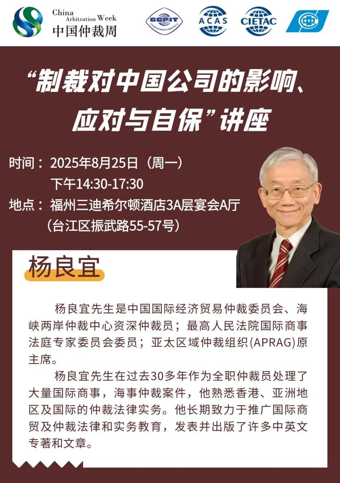由中國國際經(jīng)濟(jì)貿(mào)易仲裁委員會(huì)等單位聯(lián)合發(fā)起的2025年第十三屆中國仲裁周即將拉開帷幕。為進(jìn)一步提升中國仲裁周活動(dòng)平臺(tái)專業(yè)價(jià)值與全球影響力,福建省貿(mào)促會(huì)、海峽兩岸仲裁中心、福建省外商投資企業(yè)協(xié)會(huì)和貿(mào)仲福建分會(huì)將于2025年8月25日舉辦“制裁對(duì)中國公司的影響、應(yīng)對(duì)與自?!敝v座,期待各位嘉賓報(bào)名參與。