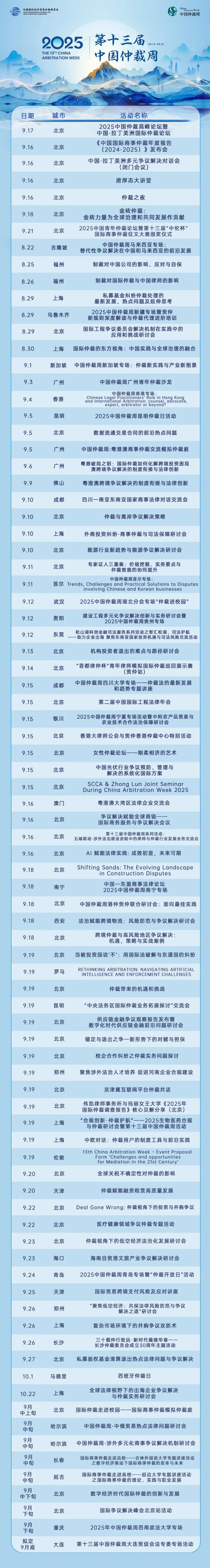 2025年9月,一年一度的中國仲裁周即將如約而來。十三載春秋砥礪,篤定前行,中國仲裁周積極搭建全球仲裁法治交流與合作橋梁,不斷探尋國際商事仲裁發(fā)展前沿,平臺規(guī)模逐步擴大,專業(yè)價值與全球影響力日益攀升。目前,2025年中國仲裁周多項專場活動正在加緊籌備,我們期待能與更多新朋老友并肩同行,擁抱數(shù)智,共啟未來。