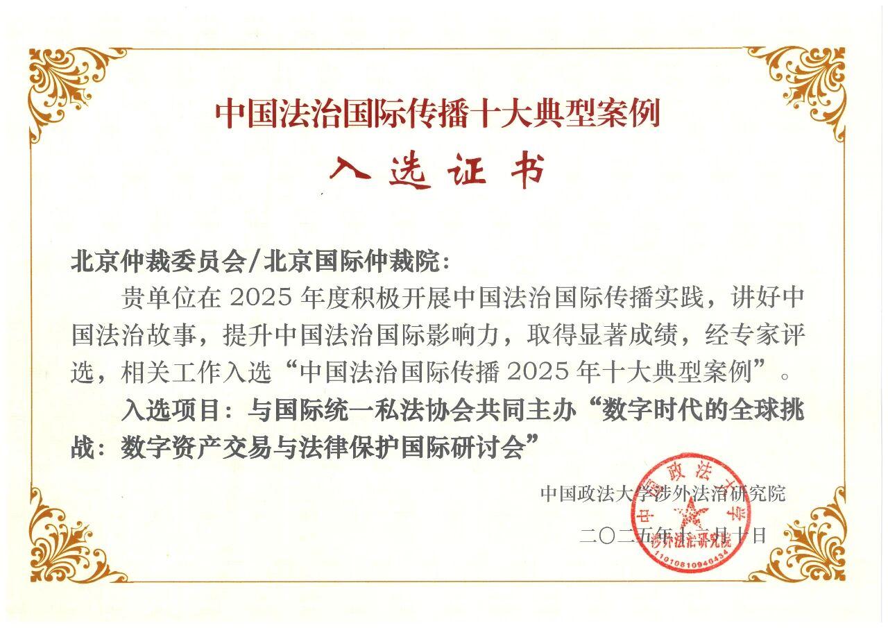 為加強中國法治的國際傳播,統(tǒng)籌推進國內(nèi)法治與涉外法治,中國政法大學(xué)涉外法治研究院組織評選并發(fā)布了2025年“中國法治國際傳播十大典型案例”。北京仲裁委員會/北京國際仲裁院/中國(北京)證券期貨仲裁中心(以下稱“北仲”)與國際統(tǒng)一私法協(xié)會(UNIDROIT)、北京國際爭議解決發(fā)展中心共同主辦的“數(shù)字時代的全球挑戰(zhàn):數(shù)字資產(chǎn)交易與法律保護”國際研討會成功入選。這是繼2020年北仲舉辦的中國商事爭議解決年度觀察海外發(fā)布會入選2020“中國法治國際傳播十大典型案例”后,北仲實踐再次入選。