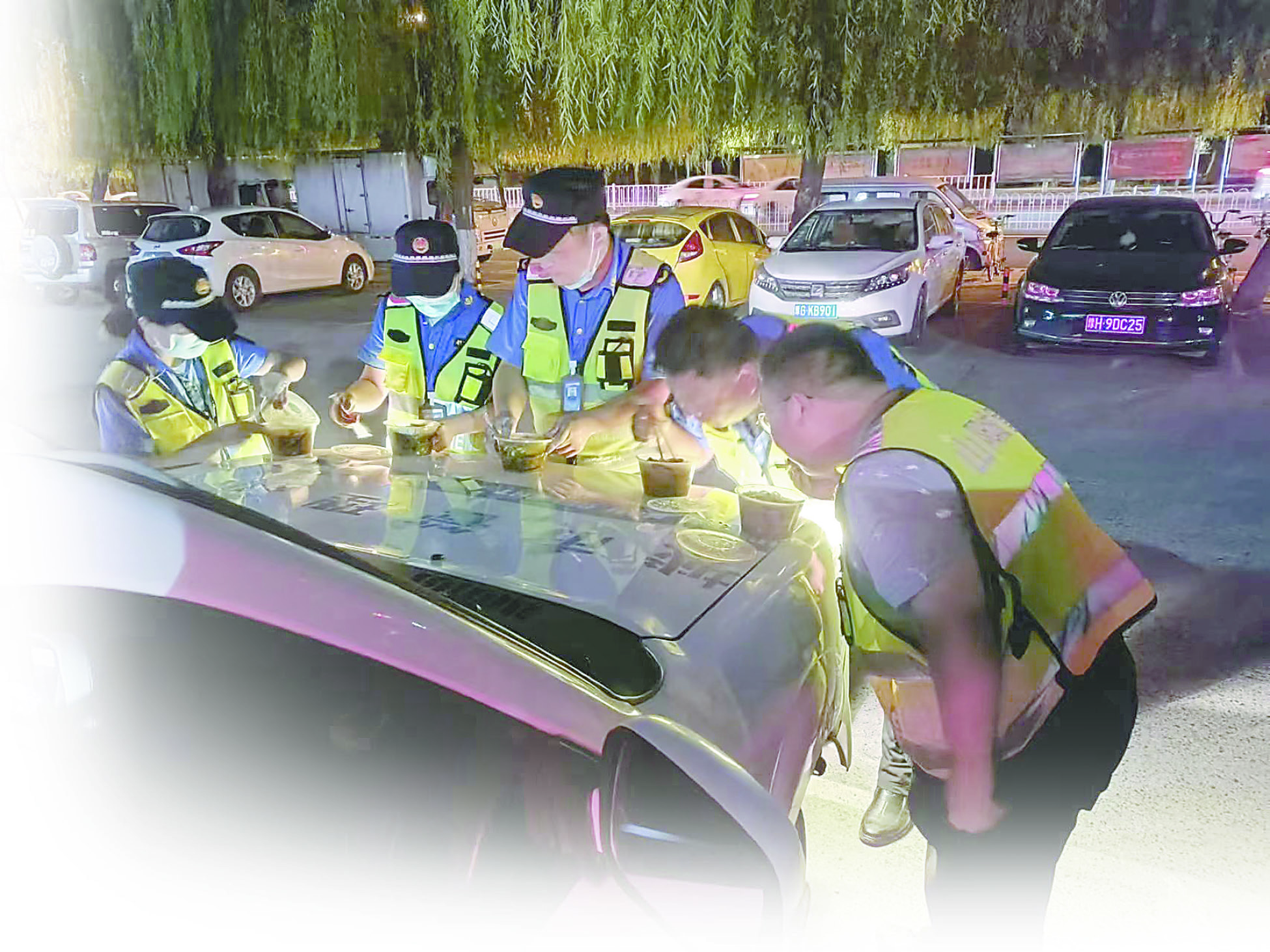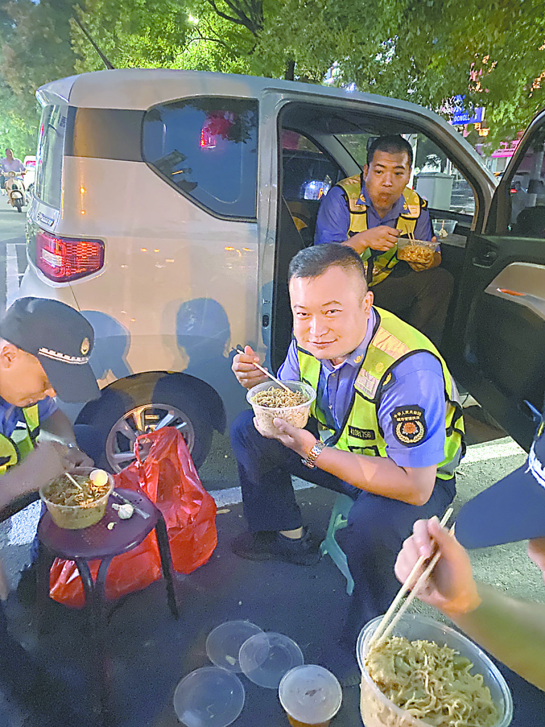 圖④ 山陽區(qū)城管局執(zhí)法三中隊隊員用車頭當(dāng)臨時“餐桌”,夜色下燈光很美,但他們就餐的姿勢更美。