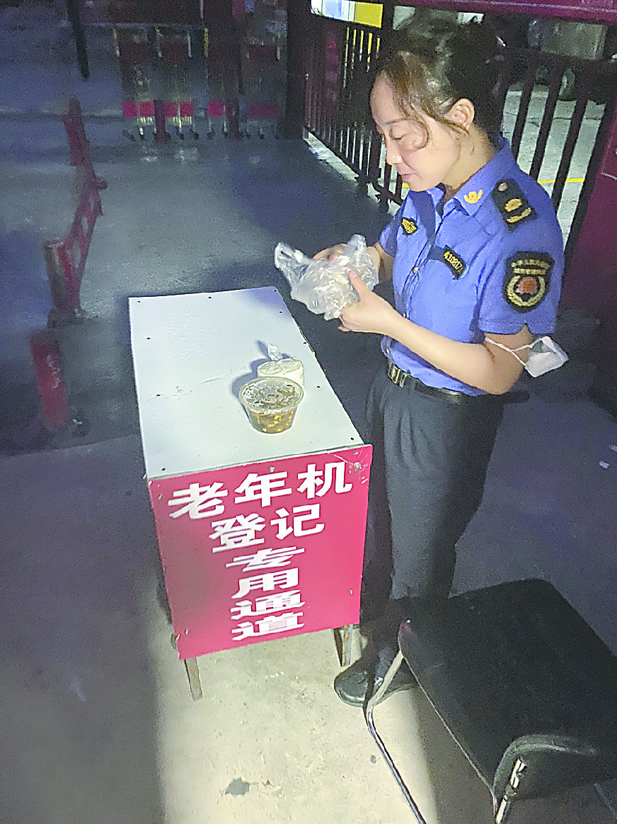 圖⑤ 山陽區(qū)城管隊員耿玉敏利用老年機登記臺就餐。