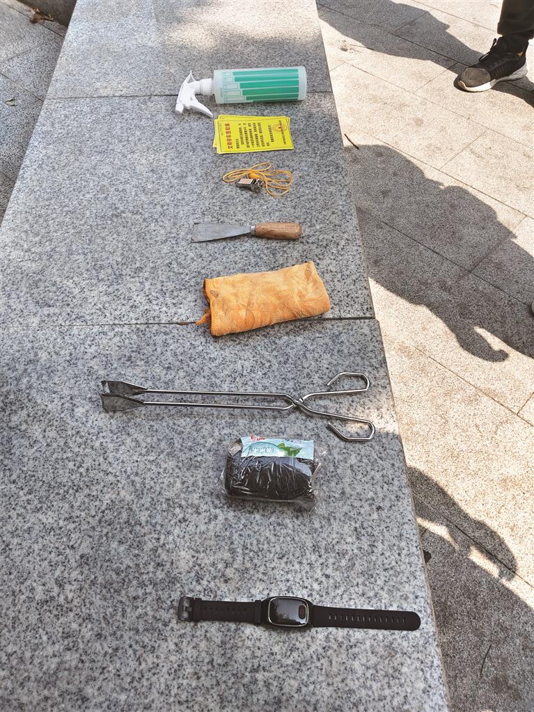 “非機動車停車區(qū)的車輛亂停,請來整理?!薄皬V場上有一塊油污,趕緊把洗掃機開過來清理?!薄肮徽九_上的座椅上有灰塵,來擦拭下?!薄浾攥F(xiàn)場看到,新吳“城市管家”除了統(tǒng)一著裝和隨身攜帶一部對講機外,還統(tǒng)一配備了智能手環(huán)、噴水壺、鏟子、夾子、干濕抹布、口哨、文明停車告知單等作業(yè)“八件套”(如圖)。江溪街道“城市管家”郭師傅邊展示他的裝備邊介紹:“這些都是我們?nèi)粘9ぷ髦械挠H密‘伙伴’,能讓我的工作更高效。比如智能手環(huán),不僅能記錄我日常的工作軌跡,還能監(jiān)測心率、血壓、血氧等身體數(shù)據(jù)。如果在工作中出現(xiàn)身體不適,手環(huán)會及時提醒我休息。鏟子、噴水壺、抹布等工具小巧便捷,分類放到定制的腰包里,隨身攜帶,拿取方便?!?/p>