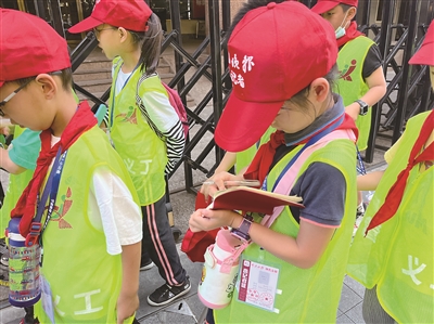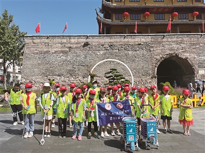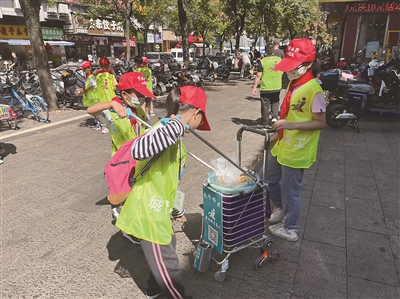 10月2日,氣溫已經(jīng)突破30℃,一群身穿“城管義工”綠馬甲的寧波晚報(現(xiàn)代金報)小記者出現(xiàn)在鼓樓街道,他們熟練地撿垃圾、撿煙蒂、扶單車。