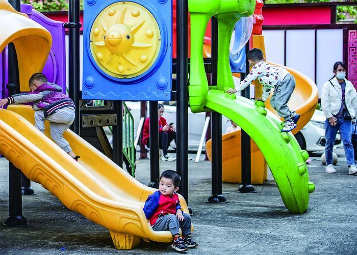 海南省瓊海市因地制宜利用城市社區(qū)空閑邊角地,建成多處“口袋公園”等休閑健身娛樂(lè)場(chǎng)所,有效拓展城市空間。圖為該市登仙嶺社區(qū)的小朋友在“口袋公園”玩耍。( 蒙鐘德 )