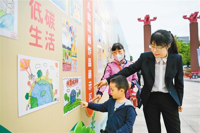 上午9時(shí)許,記者看到,設(shè)立在活動(dòng)現(xiàn)場(chǎng)的生態(tài)文明建設(shè)成效主題展板吸引市民紛紛駐足圍觀。另一側(cè)的巨大圖畫墻上,集中展示著由100名小朋友親手繪制的環(huán)保作品,用兒童的視角傳遞著環(huán)保理念。