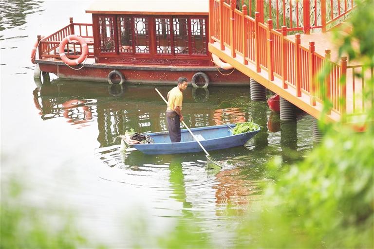近日,黔南州福泉市金山體育生態(tài)公園沙河河段,河道保潔員正在打撈河面漂浮物。近年來,福泉市在做好河湖水質監(jiān)測的同時,組織專、兼職人員開展河湖水道清理工作,不斷改善水質和生態(tài)環(huán)境。(黃歡 攝)