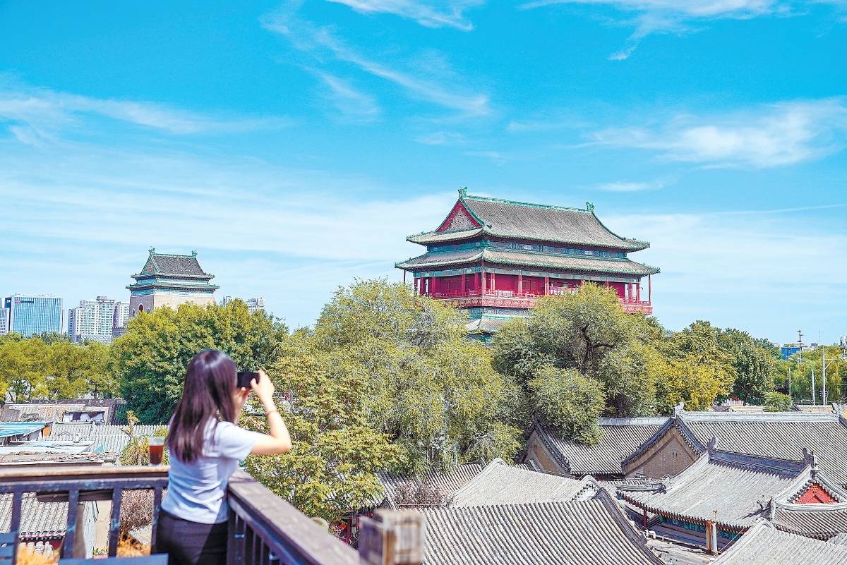 初秋,站在鼓樓底下抬頭看,云卷云舒,紅墻灰瓦,重檐屋頂?shù)木G琉璃剪邊在藍(lán)天下閃閃發(fā)亮。鼓樓內(nèi),一場(chǎng)數(shù)字沉浸展,讓600多歲的古建獲“新生”;隆隆鼓聲,穿過(guò)紅墻,伴著悠悠鴿哨;鼓樓外,三岔路口,107路公交緩緩駛過(guò),拍照打卡的游人絡(luò)繹不絕……