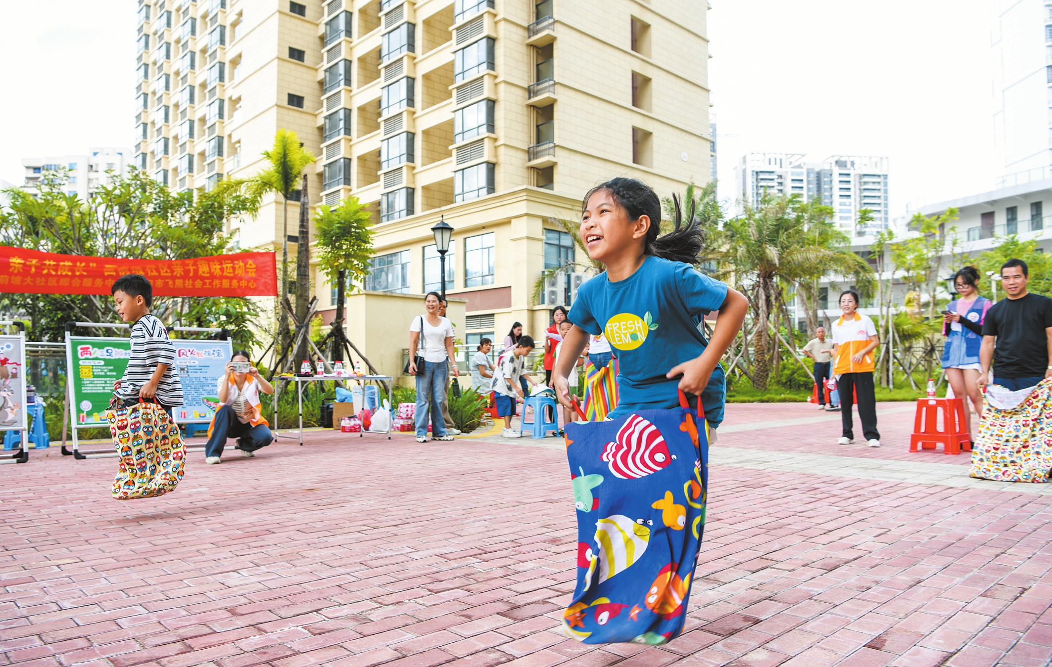 9月16日,在面前坡社區(qū)組織開展的親子趣味運(yùn)動(dòng)會(huì)上,小朋友正在參加“歡樂(lè)袋鼠跳”游戲。記者 康登淋 攝