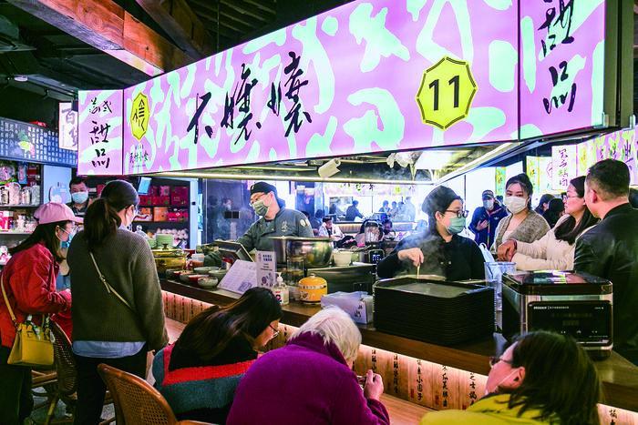 市集分為生鮮區(qū)、小食區(qū),共有經(jīng)營戶79戶。生鮮區(qū)按照商品種類設(shè)置交易區(qū),分別為冷凍、鮮肉、水產(chǎn)、豆制品、蔬菜、南北貨、綜合7大類,補(bǔ)齊城市公共設(shè)施短板,滿足周邊居民生活所需。小食區(qū)內(nèi),集中的特色餐飲縮短了游客們熟悉一座城市的時(shí)間。糖水鋪、茶館、特色小吃應(yīng)有盡有;新增酒肆、茶館等15個(gè)特色檔口,檔口均設(shè)置“沿街門”及“市集門”,前后貫通,增加了生動(dòng)而通透的視覺體驗(yàn)。