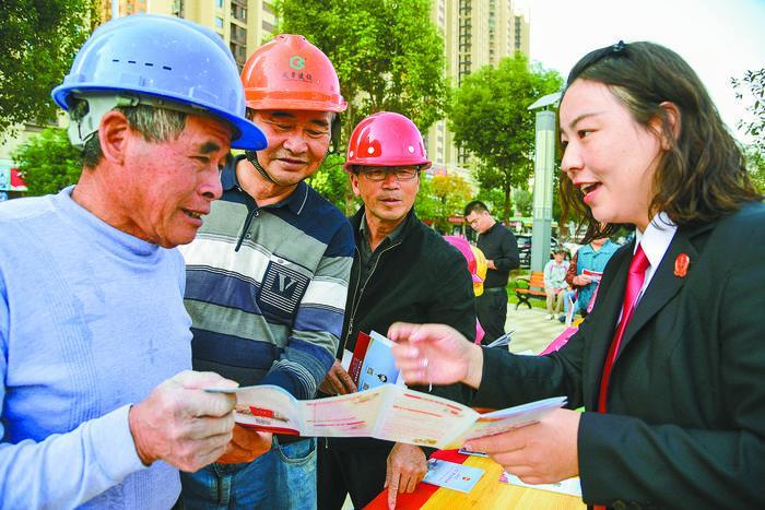 近日,江蘇省鎮(zhèn)江市相關(guān)部門聯(lián)合開展“送法進(jìn)工地,法援伴我行”活動(dòng),工作人員和律師走進(jìn)轄區(qū)建設(shè)工地,向外來(lái)務(wù)工人員普及《中華人民共和國(guó)民法典》《保障農(nóng)民工工資支付條例》等法律法規(guī)知識(shí)和維權(quán)援助方法,增強(qiáng)工人們的法治意識(shí)。圖為法院工作人員為外來(lái)務(wù)工人員講解法律維權(quán)知識(shí)。(石玉成)