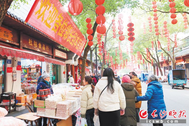 “生活甜甜”“平安大賺”“所愿皆所成”……大紅燈籠高高掛起,喜慶條幅迎風(fēng)飄揚(yáng),1月28日,臘月十八,瀏陽(yáng)市淮川街道歷史文化街區(qū)——嗣同路上洋溢著濃濃的新春氣息,“嗣同巷里的煙火‘瀏’年”年貨集市熱鬧非凡,前來(lái)置辦年貨的市民絡(luò)繹不絕。