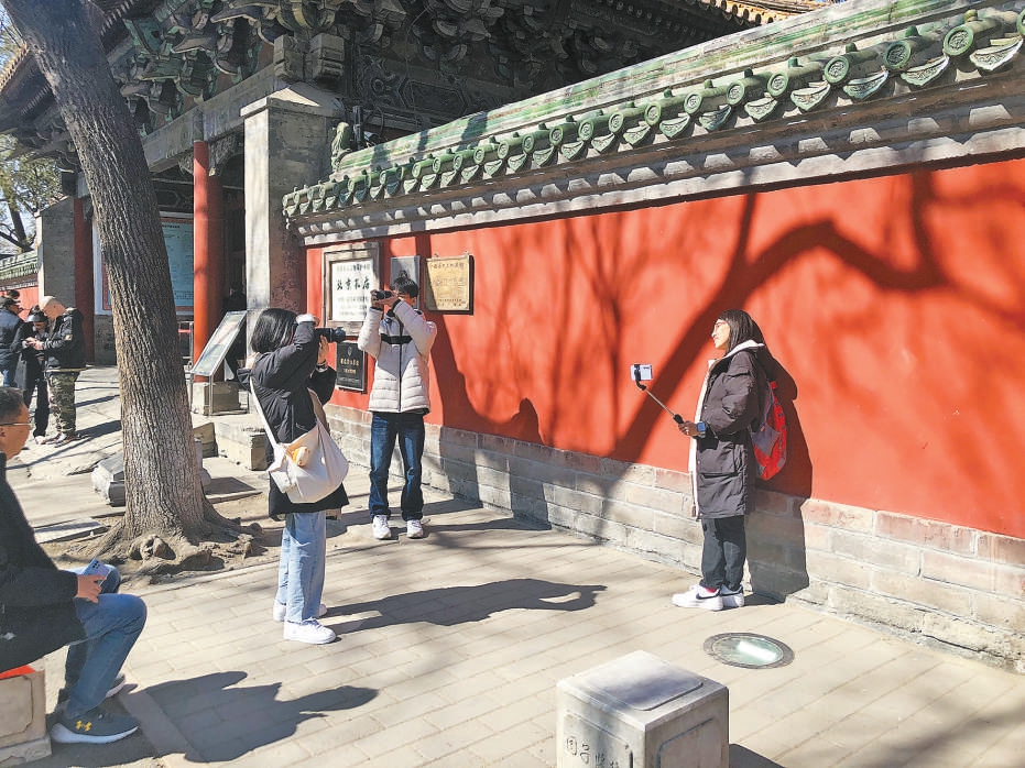 今年春節(jié)期間,國子監(jiān)街恢復(fù)了游客摩肩接踵的熱鬧,日均游客量達到了三四萬人次。春節(jié)過后,隨著氣溫回升,周末的單日客流量也能達到1.5萬人次??讖R的紅墻下、國子監(jiān)街的牌樓前,隨處可見中外游客拍照打卡的身影。