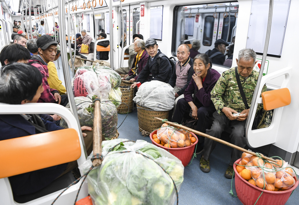 圖為菜農(nóng)乘坐重慶軌道交通4號(hào)線,前往城區(qū)的菜市場(chǎng)售賣農(nóng)產(chǎn)品。(記者 王全超 攝)