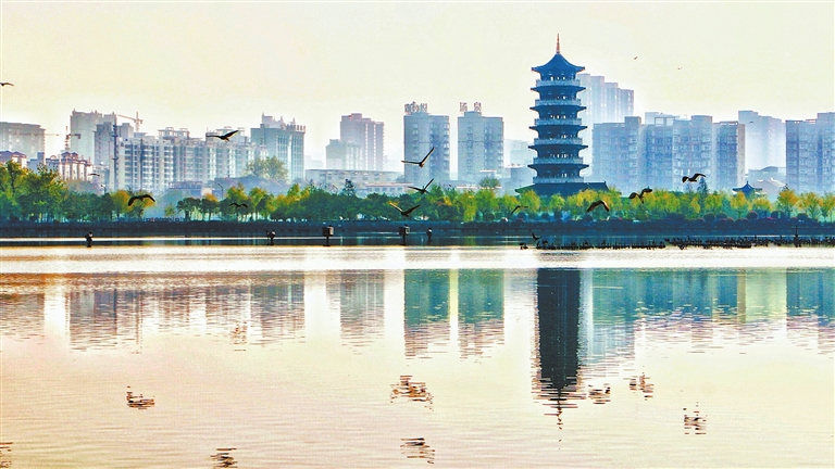4月7日,河南省柘城縣容湖國(guó)家濕地公園旭陽(yáng)初照,薄霧繚繞,湖面上鷺鳥(niǎo)飛舞,景色一新。近年來(lái),該縣致力打造高品質(zhì)城市綠化空間,讓群眾享受到自然、和諧、生態(tài)的園林綠化建設(shè)成果。(張子斌 攝)