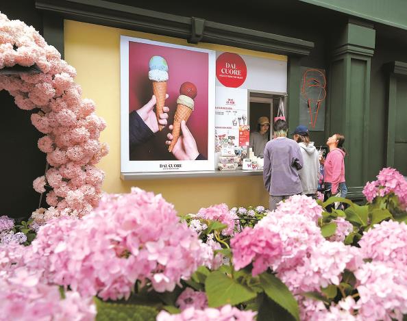 “早在裝修階段,公司就想好了,要在臨街墻面開個(gè)洞,引入網(wǎng)紅冰淇淋快閃店,店外布置成外擺位。到時(shí)候吃個(gè)冰淇淋,再進(jìn)店看看試試衣服,順理成章?!辈怀鏊?,年輕人排隊(duì)買好網(wǎng)紅冰淇淋留影,然后坐進(jìn)開滿繡球花的外擺位,成為大學(xué)路上的一道風(fēng)景線,而這些消費(fèi)者有不少都會(huì)走進(jìn)店里看看?!白罡叻宓臅r(shí)候,一天有6000人進(jìn)店。”