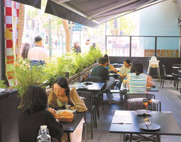 去年9月開業(yè)的鴻壽坊,是由多棟石庫(kù)門建筑組成的城市微更新項(xiàng)目。盡管商業(yè)面積僅1.5萬(wàn)平方米,但今年“五一”假期卻吸引客流35萬(wàn)人次,單日客流創(chuàng)今年新高。這個(gè)項(xiàng)目定位“精致煙火氣”,在石庫(kù)門、梧桐樹、窄弄堂等各種海派生活場(chǎng)景中,外擺位隨處可見?!绊?xiàng)目在規(guī)劃之初,對(duì)外擺位的具體位置、呈現(xiàn)方式,就有很明確的想法?!比鸢残绿斓伉檳鄯豁?xiàng)目總經(jīng)理王瑩告訴記者,外擺位不是放幾張桌子、幾把椅子這么簡(jiǎn)單,商戶既有需要統(tǒng)一遵守的規(guī)范,做到門前責(zé)任三包,也有值得推敲的細(xì)節(jié),要形成自己的風(fēng)格和特色。