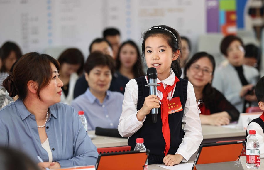 蓬萊路第二小學的孩子在向黃浦區(qū)婦聯(lián)、老西門街道負責人提出自己對兒童友好空間打造的建議。 蔡維帥 攝