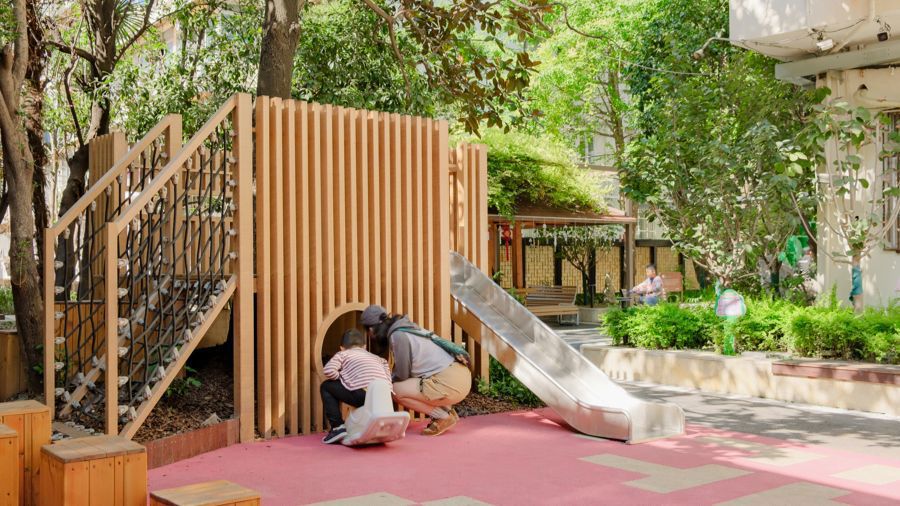 最終,設計師圍著一棵廣玉蘭和一棵小桂花樹打造了“兒童游戲區(qū)”,設計了小小的樹屋滑梯,提供爬網(wǎng)與木樁小山的雙重攀爬選擇。木樁小山背后設計了一個超大的黑板墻?!耙庀氩坏降摹糜谩>游刹扛嬖V我們,孩子們在黑板上不只是涂涂畫畫,還能寫作業(yè)、算數(shù)學題?!?/p>