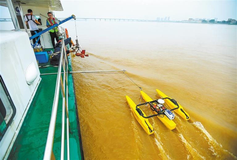 6月19日,江西省樟樹(shù)市水文水資源監(jiān)測(cè)大隊(duì)隊(duì)員利用走航式ADCP進(jìn)行流量測(cè)驗(yàn),為及時(shí)發(fā)布洪水預(yù)警提供科學(xué)依據(jù)。周亮 攝(中經(jīng)視覺(jué))
