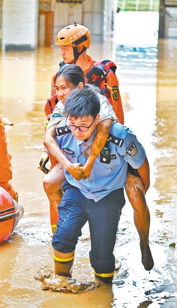6月17日,廣東省梅州市蕉嶺縣新鋪派出所民警在轉(zhuǎn)移受災(zāi)群眾。何志林 攝(中經(jīng)視覺(jué))