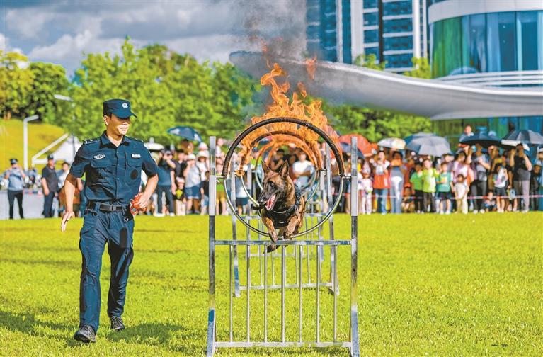 民警向市民展示警犬訓(xùn)練。記者 畢晗 通訊員 藍東鴻 攝
