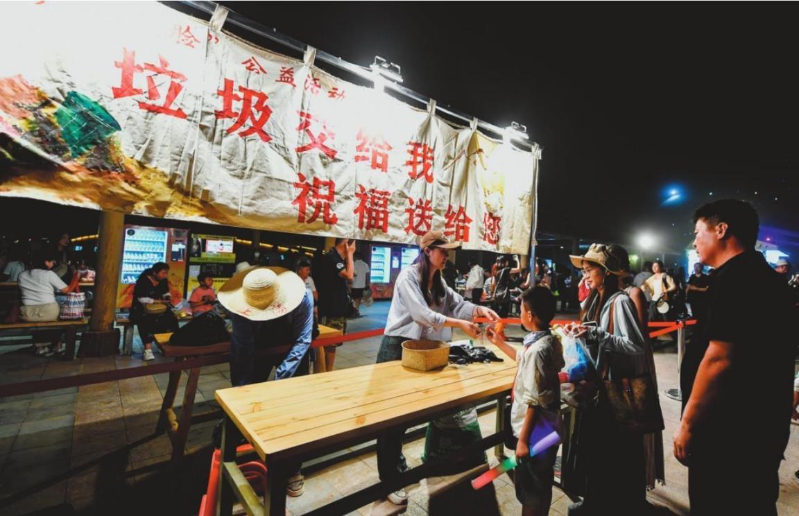 7月20日晚,在敦煌鳴沙山月牙泉景區(qū)的沙漠萬人星空演唱會現(xiàn)場,游客拎著垃圾向景區(qū)工作人員兌換小禮品。今年暑期,隨著沙漠萬人星空演唱會火爆出圈,甘肅省敦煌市鳴沙山月牙泉景區(qū)日均接待游客達2萬人次。景區(qū)推出的“沙山洗臉”公益活動,通過撿垃圾兌換小禮品等方式,引導游客在享受沙漠萬人星空演唱會浪漫的同時,共同守護鳴沙山的生態(tài)環(huán)境。