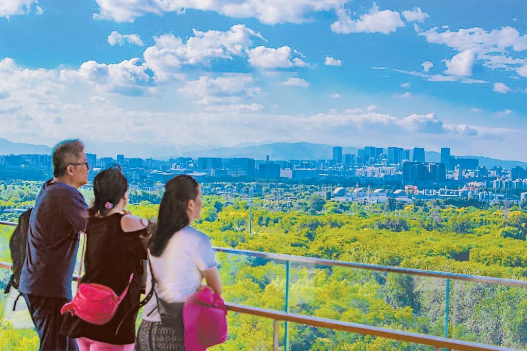 市民在南苑森林濕地公園觀景臺(tái)上欣賞京城美景。 原梓峰 攝