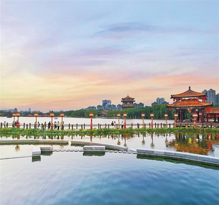 近年來,西安曲江池·大唐芙蓉園水利風(fēng)景區(qū)貫徹落實(shí)河湖長(zhǎng)制,構(gòu)建完善管理體系,有效提升河湖管理效率與動(dòng)態(tài)監(jiān)管能力,同時(shí)注重水資源集約利用,水環(huán)境保護(hù)治理取得顯著成效?!拔姨貏e喜歡這里的文化氛圍。水舞光影秀《大唐追夢(mèng)》太震撼了!站在湖邊,濃郁的盛唐文化氣息撲面而來,令人心曠神怡?!眮碜陨虾5挠慰蛥翘煊畋硎荆@樣的體驗(yàn)讓他更加喜歡西安。