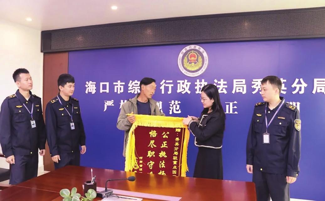 11月27日,河南籍民工朱先生向??谑芯C合行政執(zhí)法局秀英分局贈(zèng)送錦旗。林小映 攝