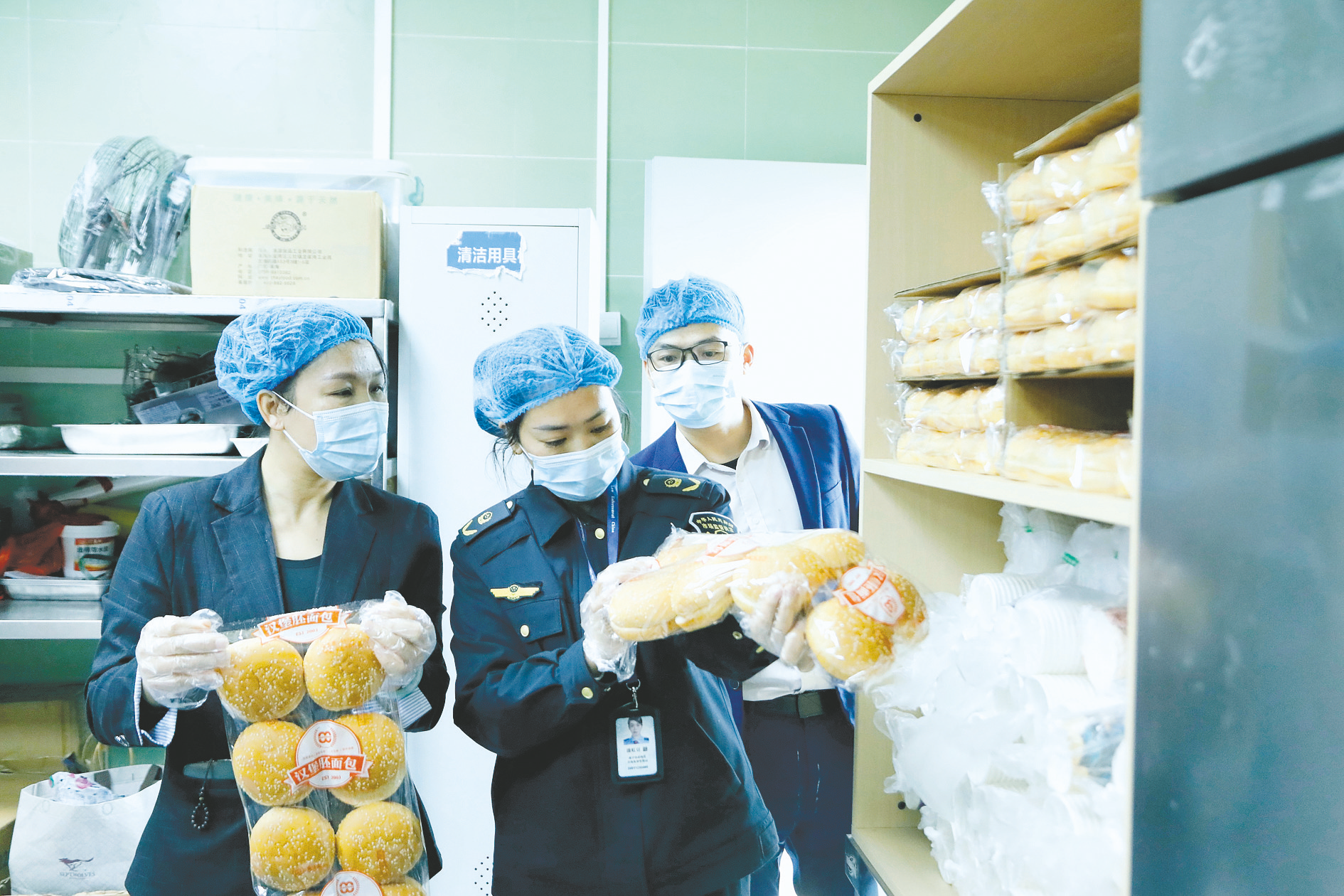 市場(chǎng)監(jiān)管部門執(zhí)法人員對(duì)學(xué)校食堂倉(cāng)庫(kù)進(jìn)行檢查。(何正君 攝)