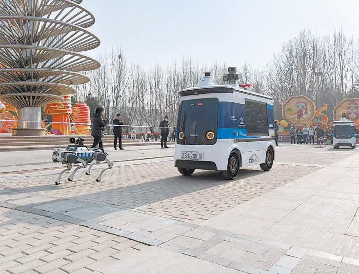 機器狗與無人駕駛巡邏車在經(jīng)開區(qū)公園內(nèi)巡邏。