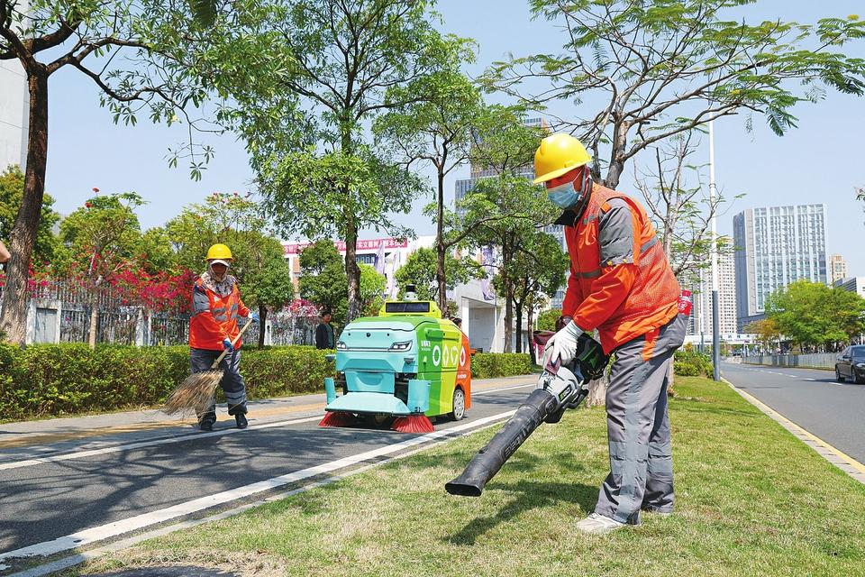 3月19日,在深圳市坪山區(qū)石井街道,環(huán)衛(wèi)機(jī)器人與環(huán)衛(wèi)工人進(jìn)行協(xié)同作業(yè)。在深圳市坪山區(qū)石井和坑梓兩個(gè)街道,道路上不時(shí)能看到彩色的環(huán)衛(wèi)機(jī)器人出沒。它們能夠自主識(shí)別垃圾、自動(dòng)返回基站倒垃圾并加水,與環(huán)衛(wèi)工協(xié)同配合完成復(fù)雜道路清掃工作。(新華社記者 毛思倩攝)