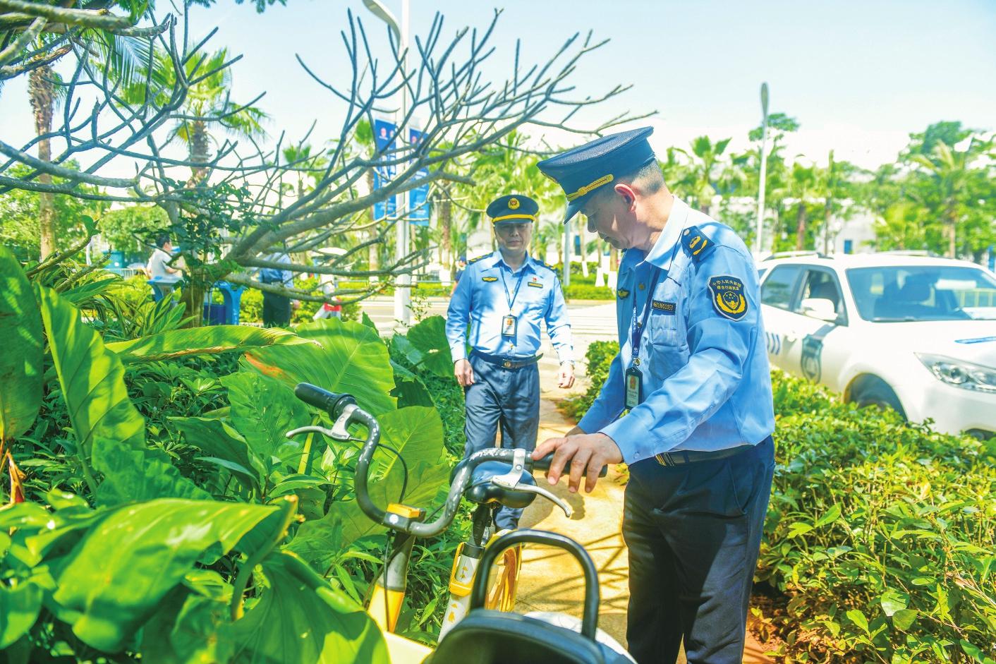 生態(tài)環(huán)境保護(hù)行政執(zhí)法支隊(duì)主要負(fù)責(zé)巡控海色路區(qū)域,維持通行秩序,為市民指引路線,清理流動(dòng)攤販,規(guī)范共享單車和電動(dòng)自行車的停放秩序。(鄧宇)