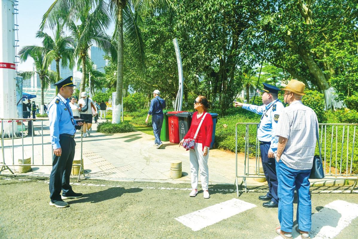 消博會(huì)期間,海口市綜合行政執(zhí)法局秀英分局執(zhí)法人員為市民指引道路。