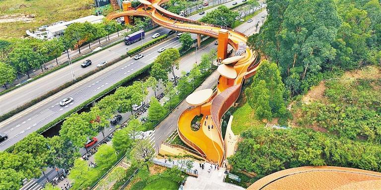 在目前深圳占地面積最大的兒童公園——龍崗兒童公園,門口飄來一條靚麗“彩帶”。這座人行天橋是公園的配套連接通道,橫跨公園門口的主干道鹽龍大道,將公園與周邊的商圈連通起來,實現“無縫”連接。帶著孩子到公園玩的胡先生表示,以前從商圈到公園需要等紅綠燈,過街時人群也比較雜亂,如今有了天橋,可以輕松到達公園門口,這么漂亮的天橋孩子們也很是喜歡。