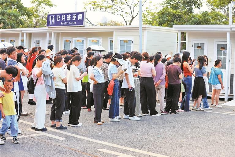 深圳灣公園內,游客在公共廁所前有序排隊等候。記者 陳玉 攝