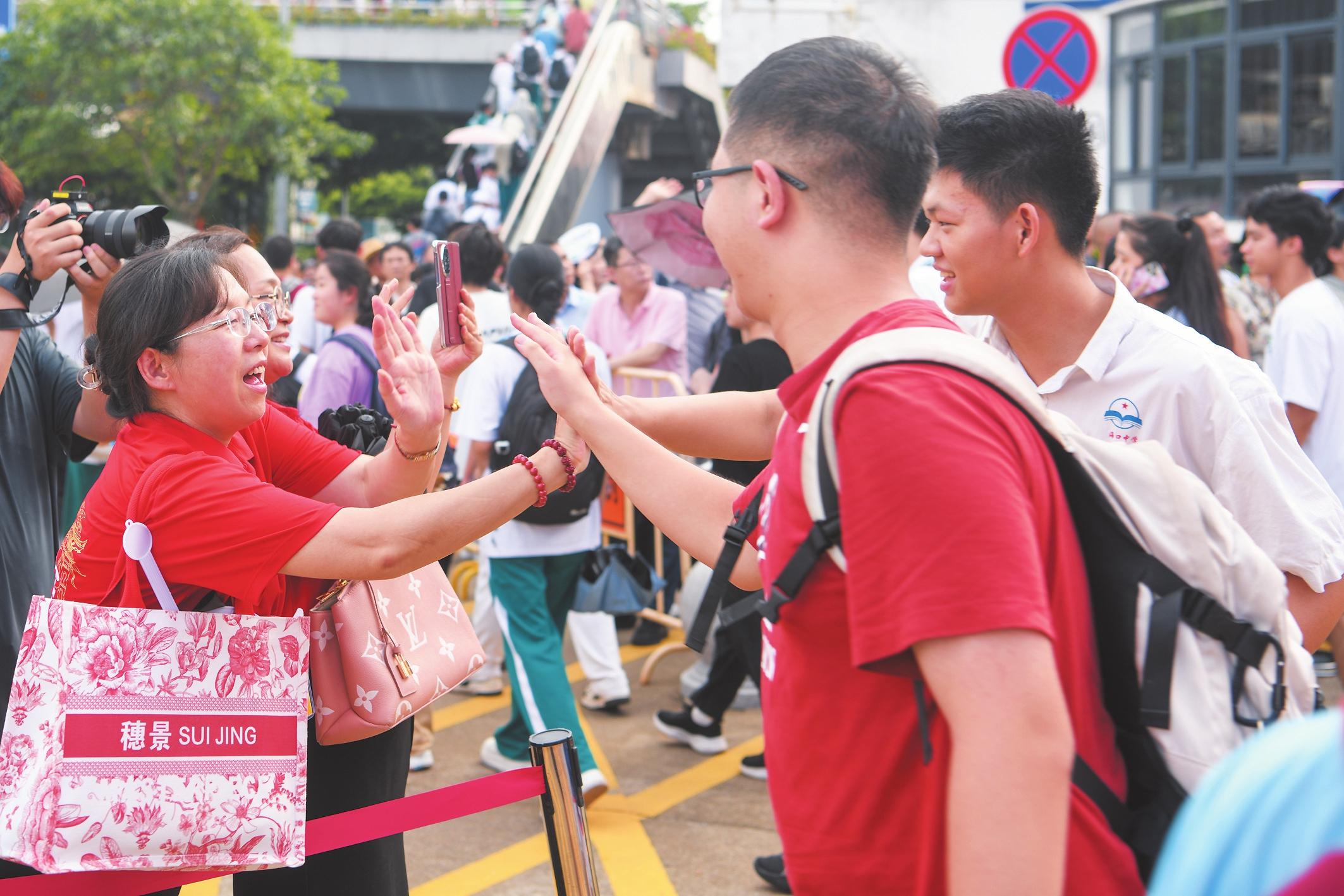 6月8日,在海南華僑中學(xué)高中部考點(diǎn)外,老師和走出考場(chǎng)的考生擊掌。記者 楊鶴 攝