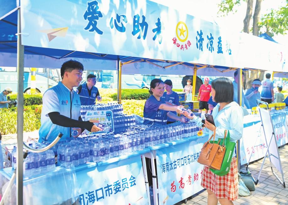 6月8日,在??诤8蹖W(xué)??键c(diǎn)外,青年志愿者為考生家長(zhǎng)送上飲用水。記者 石中華攝