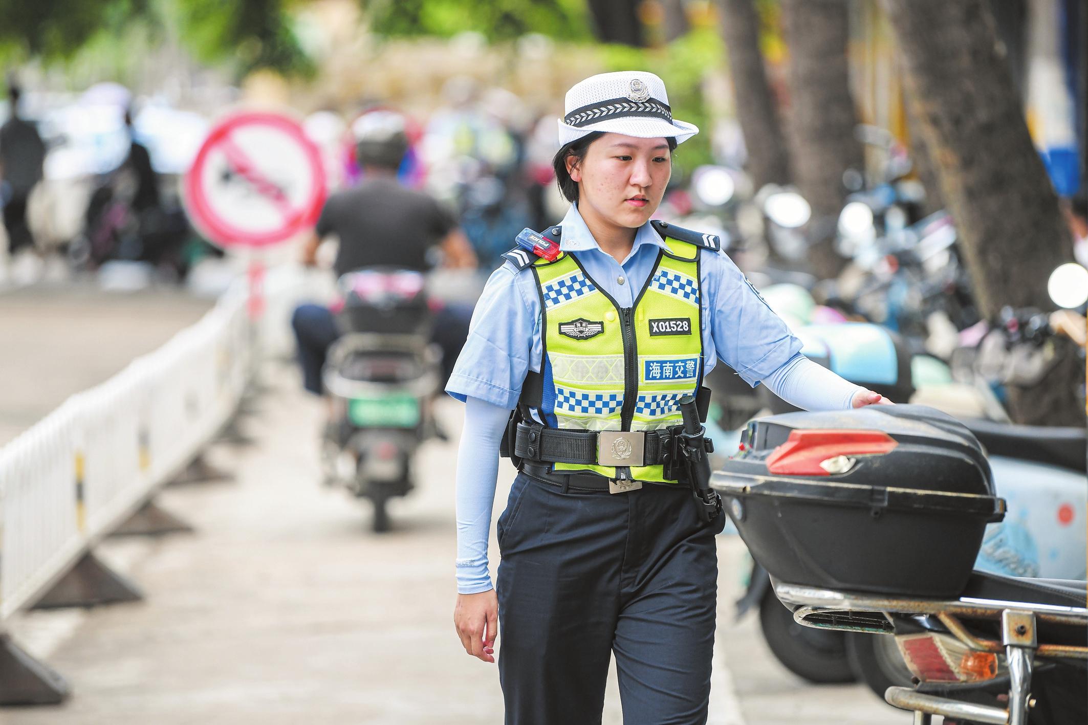 6月8日,在海南中學(xué)高中部考點(diǎn),交警正在檢查考點(diǎn)附近的電動(dòng)自行車(chē)警報(bào),為英語(yǔ)考試營(yíng)造安靜的環(huán)境。記者 蘇弼坤 攝