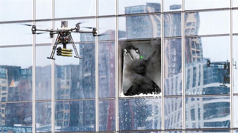 演習(xí)中,破玻無(wú)人機(jī)精準(zhǔn)發(fā)射破玻彈擊碎幕墻玻璃,開(kāi)辟排煙通道。
