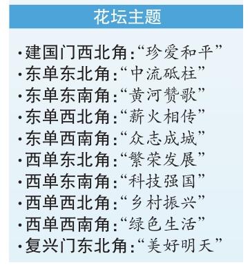 本次長安街沿線布置的立體花壇共10組,東至建國門,西到復興門,東單、西單路口各布置4組。東單路口4組花壇圍繞銘記歷史、紀念抗戰(zhàn)勝利主題;西單路口4組花壇展現(xiàn)祖國繁榮、人民幸福場景。其中,東單東北角“中流砥柱”花壇頂高最高,達10.9米。